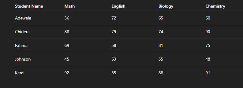 INSTRUCTION: Create a worksheet using Microsoft Excel to record students’ scores. Save the file as EXAM_SCORES_YOURNAME.xlsx TASKS 1. Enter the Data Create the table below Student Name Math English Biology Chemistry Adewale 56 72 65 60 Chidera 88 79 74 90 Fatima 69 58 81 75 Johnson 45 63 55 48 Kemi 92 85 88 91 2. Perform Calculations a. Total Score b. Average Score c. Position Use a formula to rank students based on their Total score. (E.g. =RANK(F2,$F$2:$F$6)) 3. Formatting Requirements Make the table title “STUDENT EXAM SCORES” in Cell A1, Bold, Font Size 16, Merge and Center across A1:H1. Apply All Borders to the entire table. Format the Average column to 1 decimal place. 4. Chart Create a Column Chart showing Student Names vs Total Scores. Place the chart below the table. 5. Footer Insert a footer that contains: Your Name (left). Upload the file and submit.