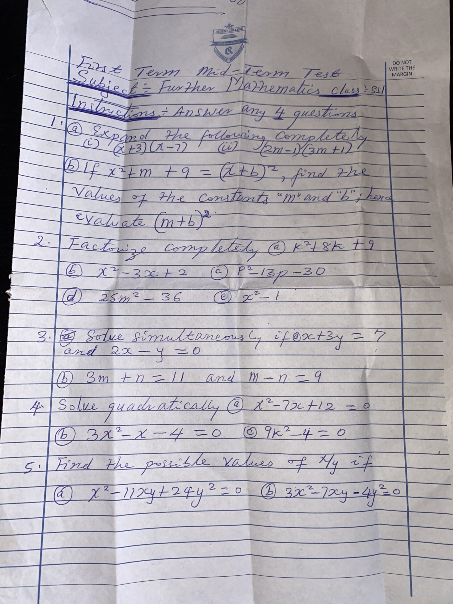 Further mathematics for SS1 First Term Mid term test 2025/2026